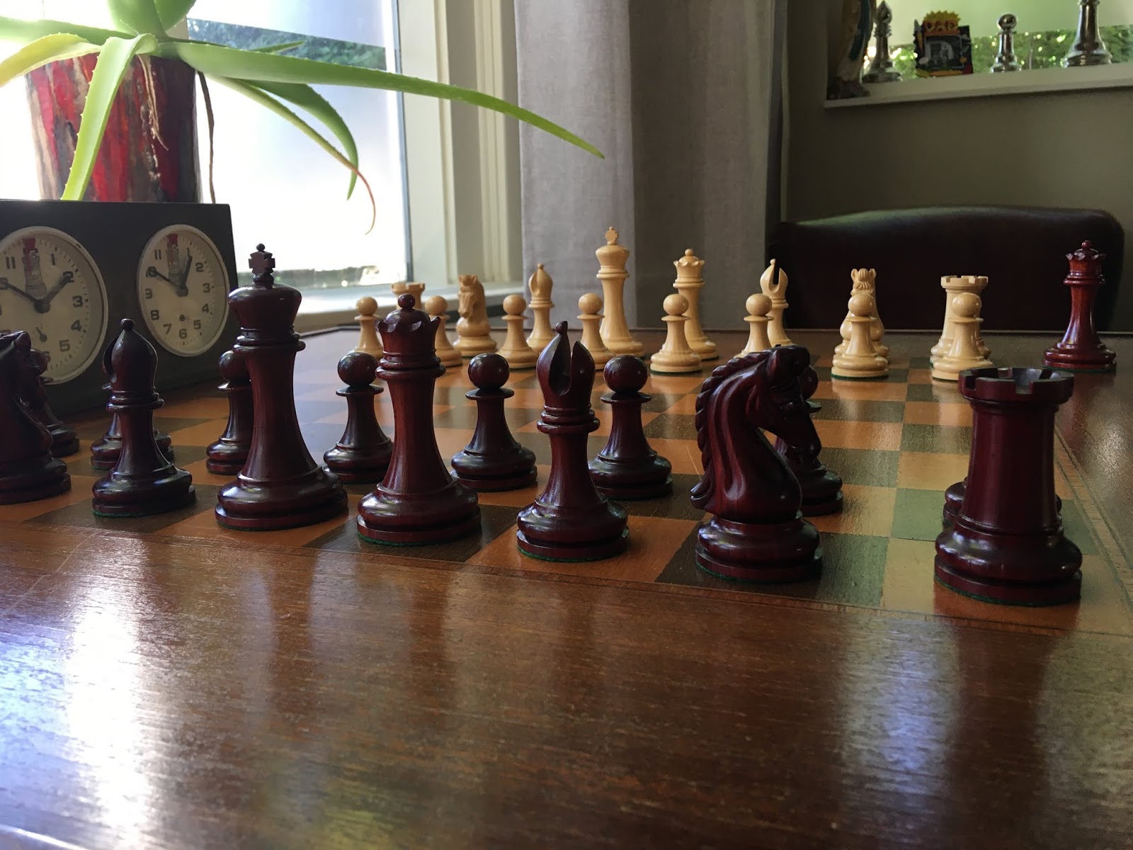 Dus snel het pakket opgehaald en thuis uitgepakt. En de schaakstukken zijn inderdaad heel mooi. Ben ook blij dat ik de zwarte stukken niet zwart maar in de houtkleur, palissander, heb genomen. Mijn favoriete stukken zijn het paard en de loper. Het paard vanwege de details, de loper vanwege de brede inkeping. Waarom die inkeping er zit is overigens voor meerdere uitleg vatbaar. De Engelsen zagen waarschijnlijk de vouw van de mijter van een bisschop in de gleuf boven in de loper, die eigenlijk de tanden van de olifant symboliseerde.Tenslotte vindt het schaakspel in Perzië haar oorsprong.